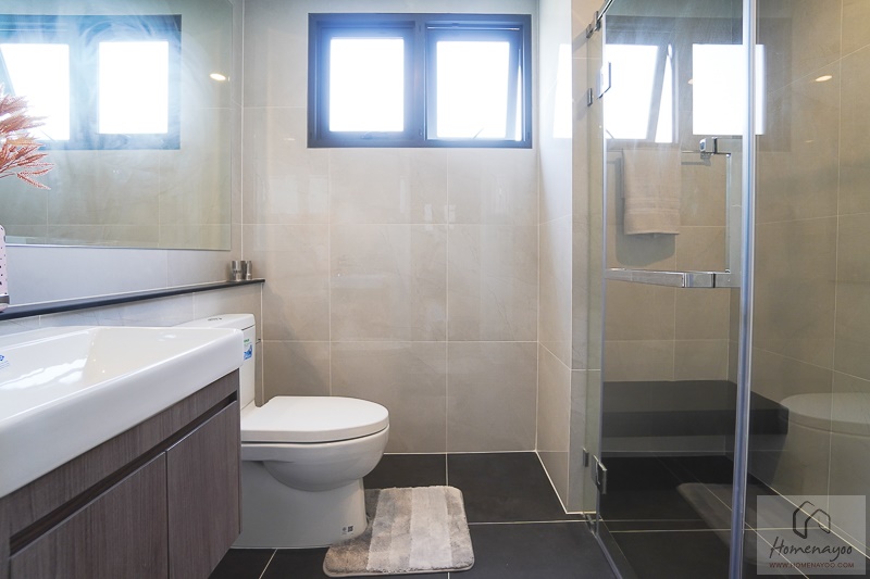 อีกฝั่งของห้องกั้นส่วนโถสุขภัณฑ์และโซน Shower ด้วยประตูกระจก Tempered อย่างเป็นสัดส่วน