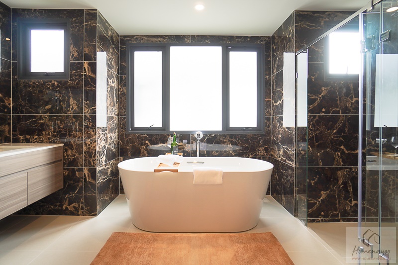แน่นอนว่า Master Bathroom จะมีความแกรนด์มากที่สุด เป็นห้องน้ำแบบ Full Function ที่มีหน้าต่างรับแสงธรรมชาติติดตั้งมาให้เยอะพอสมควร ทำให้ห้องน้ำดูสว่างและโปร่ง ตกแต่งผนังด้วยกระเบื้องลายหินธรรมชาติสีเข้มที่มีลวดลายตัดกันชัดเจน