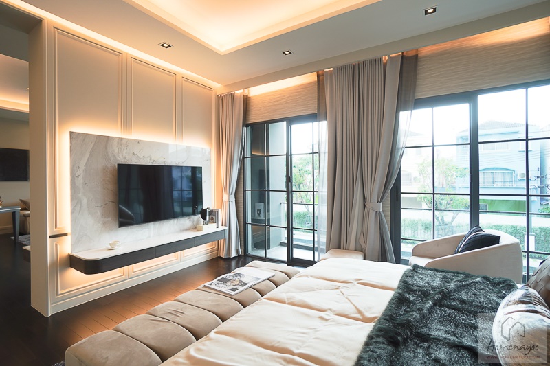 คราวนี้เราจะเข้าไปดูห้องนอนแต่ละห้องกันต่อ เริ่มจาก Master Bedroom ซึ่งเป็นห้องนอนที่มีขนาดใหญ่และแกรนด์ที่สุดของบ้าน
