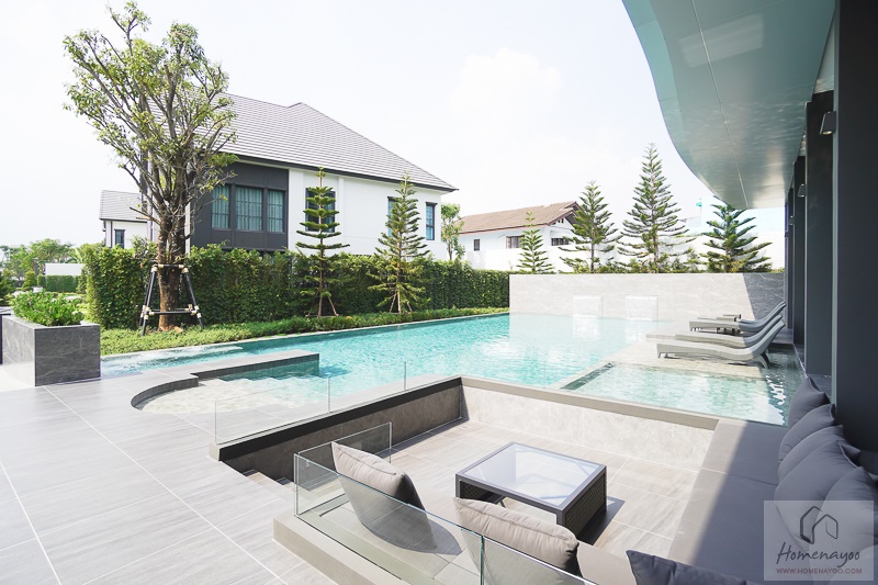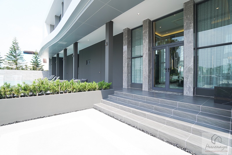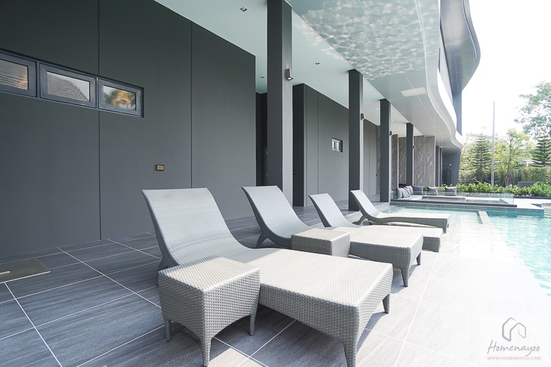 บริเวณด้านหน้าอาคารออกแบบเป็นฟังก์ชันโซน Outdoor เป็นสระว่ายน้ำระบบน้ำเกลือแบบ Overflow