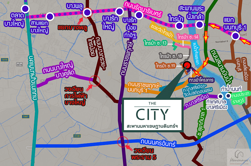 ที่ตั้งโครงการ The City สะพานมหาเจษฎาบดินทรานุสรณ์ ตั้งอยู่ในไทรม้าซอย 19 โดยทางเข้าออกโครงการจะอยู่ติดกับถนนราชพฤกษ์-นนทบุรี 1 ใกล้ๆกับสะพานมหาเจษฎาบดินทรานุสรณ์ และมีทางเข้าออกได้อีกทางจากฝั่งถนนรัตนาธิเบศร์โดยเข้าได้จากซอยวัดไทรม้าและมาเชื่อมเข้า ไทรม้าซอย 13, 14, 18 และ 19 เพื่อเชื่อมมายังพื้นที่โครงการครับ การเดินทางหลักๆก็ใช้เส้นราชพฤกษ์-นนทบุรี 1 ซึ่งเป็นเส้นที่เชื่อมระหว่างถนนสนามบินน้ำ และถนนราชพฤกษ์ ถ้าไปใช้ถนนรัตนาธิเบศร์ก็เชื่อมต่อไปได้อีกหลายเส้นทางครับ