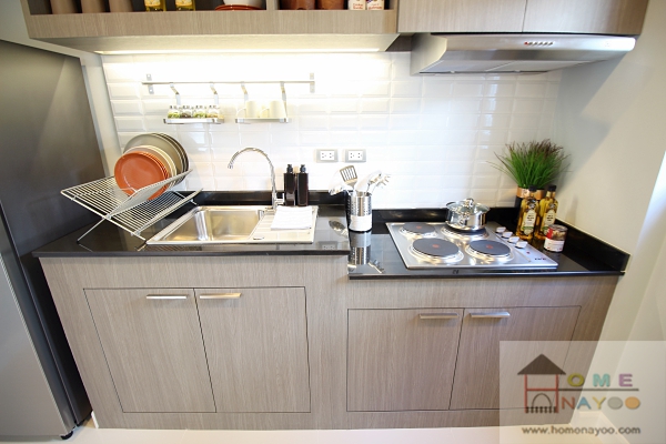 ท้อปครัวเป็นหินแกรนิตสีดำ ส่วนเตามีการลดระดับลงมาเพื่อให้ทำอาหารได้ง่าย อ่างล้างจานเป็นอ่างสแตนเลสมีที่พักจานด้านข้าง ผนังหลังเคาน์เตอร์ครัวมีเต้าเสียบปลั๊กไฟมาให้สองจุด