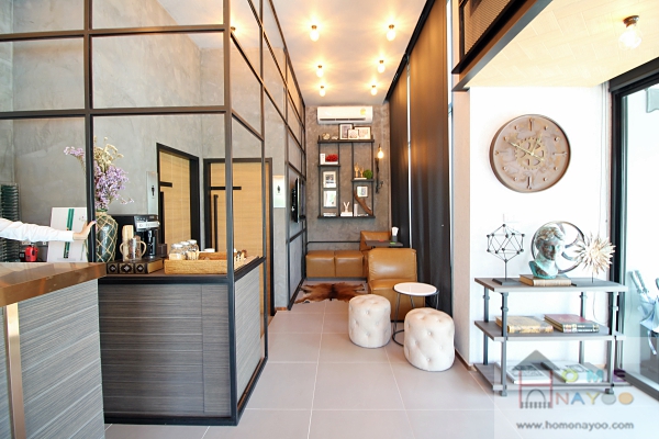 เข้าไปดูด้านใน Clubhouse ตอนนี้จะเป็นส่วนของสำนักงานขาย จัดมาเป็นแนวร้านกาแฟแบบวินเทจลอฟต์ โทนสีเทาน้ำตาล