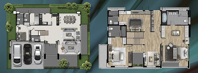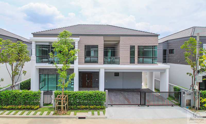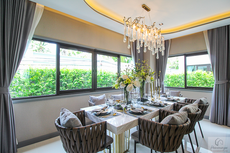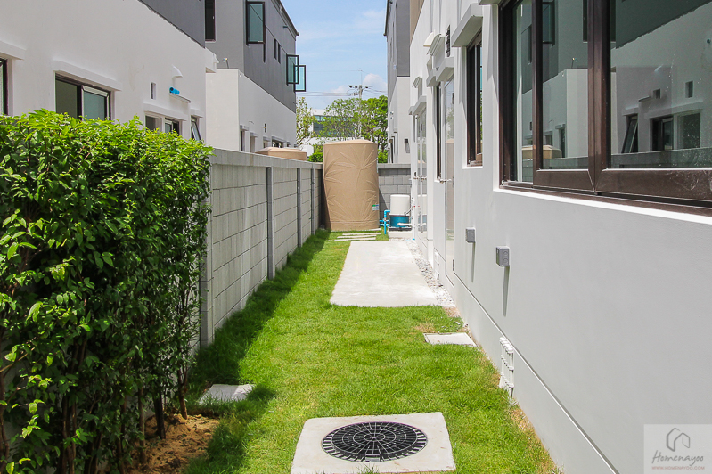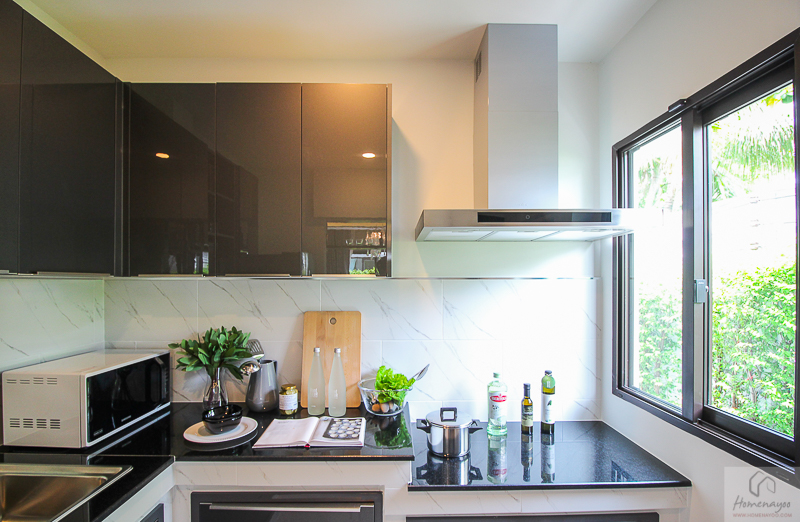 วัสดุในบ้าน – ได้ของมีคุณภาพสมราคา เริ่มตั้งแต่ประตูหน้าบ้านจะได้บานไม้สัก พร้อมระบบ Smart Door Lock หน้าต่างทุกบานได้กระจกใสเขียวตัดแสงกรอบเป็น UPVC พื้นชั้นล่างเป็นกระเบื้องแกรนิตโต้ขนาด 60 x 60 ซม. พื้นชั้น 2 เป็นไม้ลามิเนตหนา 8 มม. ผนังได้วอลเปเปอร์ทั้งหลัง สุขภัณฑ์ในห้องน้ำของ American Satndard บันไดเป็นคอนกรีตเสริมเหล็กท็อปไม้สำเร็จรูป ไฟดาวน์ไลท์ทั้งหมด ในส่วนครัวได้ชุดเคาน์เตอร์ครัวตู้มี Soft close ให้ทุกบาน หน้าบานเป็นแบบ High Gloss ส่วนท็อปเคาน์เตอร์ครัวเป็นหินแกรนิตสีดำ ได้อ่างล้างจานและเครื่องดูดควัน บ้านทุกหลังจะได้สัญญาณกันขโมย ระบบ Magnetic & Motion Sensor และได้ระบบ Home Automation ติดตั้ง CCTV ตรงที่จอดรถ