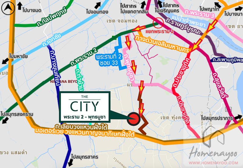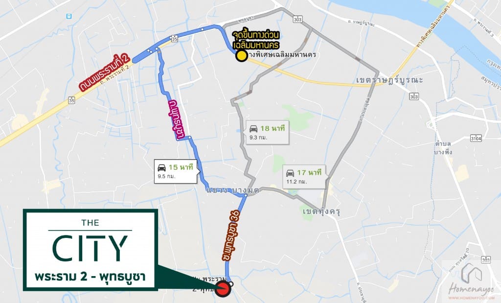 หรืออีกทางถ้าลงทางด่วนเฉลิมมหานครมาเข้าสู่ถนนพระราม 2 จากนั้นเบี่ยงซ้ายออกทางคู่ขนาน และไปเลี้ยวเข้าพระราม 2 ซอย 33(ครัวเจ๊ง้อ พระราม 2) จากนั้นไปเชื่อมเข้าถนนพุทธบูชาตรงซอยพุทธบูชา 24 จากนั้นก็วิ่งตามทางเดิมไปยังโครงการต่อครับ