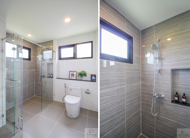 อีกฝั่งเป็นส่วนเปียก ติดตั้งฝักบัวมาให้เรียบร้อย พร้อมช่องวางอุปกรณ์อาบน้ำต่างๆ