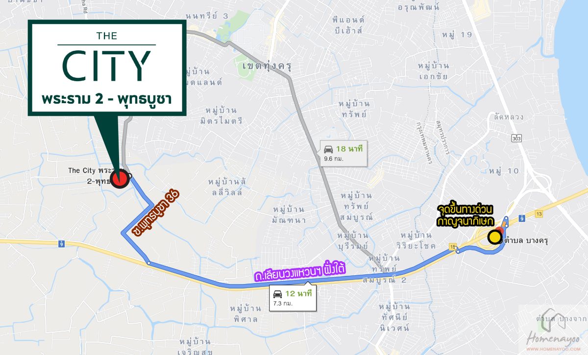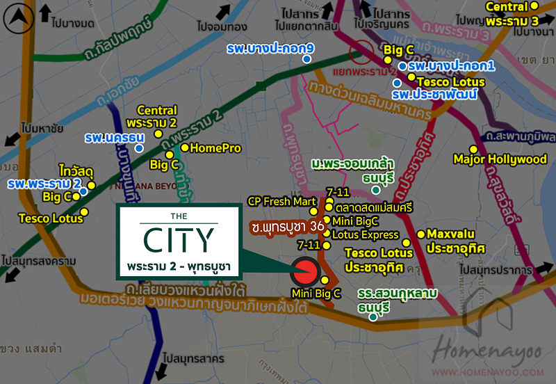 ทำเลที่ตั้งโครงการ – The City พระราม 2-พุทธบูชา ตั้งอยู่ในย่านพุทธบูชา บรรยากาศโดยรอบโครงการค่อนข้างเงียบสงบเหมาะแก่การพักอาศัย ความอุดมสมบูรณ์รอบๆโครงการในซอยพุทธบูชา 36 มีร้านสะดวกซื้อทั้ง 7-11, CP Fresh Mart, Mini Big C, Lotus Express มีตลาดสดแม่สมศรี มีร้านค้าร้านอาหารหลายร้าน ตรงถนนพุทธบูชาตั้งแต่ปากทางเข้ามาก็มีร้านค้าร้านอาหารเป็นระยะๆ หรือจะไปแถวเส้นประชาอุทิศ มีร้านค้าร้านอาหารหลายร้านเลย ตลาดก็มีให้เลือกเยอะทั้งตลาดวัดทุ่งครุ ตลาดยิ่งรวย ตลาดทิพย์พลาซ่า