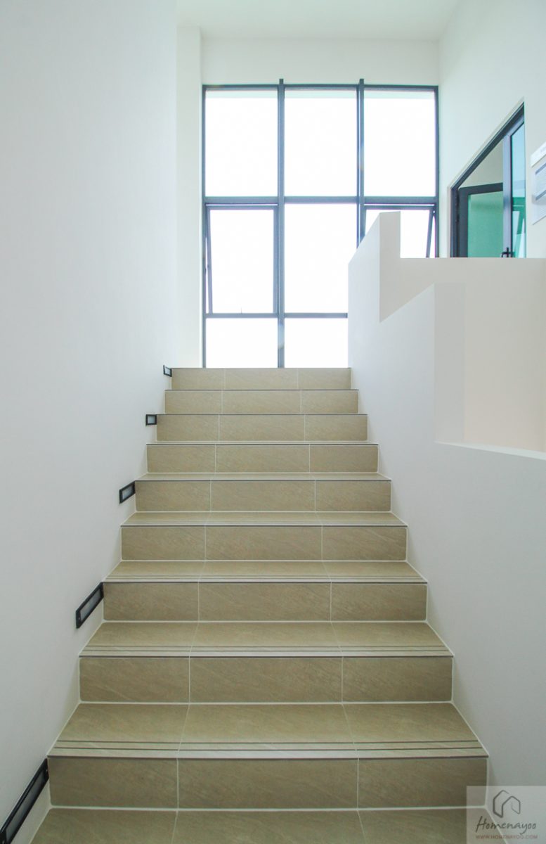 ขึ้นมาที่ชั้นสองจะเจอโถงบันไดก่อน พื้นที่จะเชื่อมกับส่วนนั่งเล่นขวามือ พื้นชั้นสองจะเป็นลามิเนตหนา 8 มม.