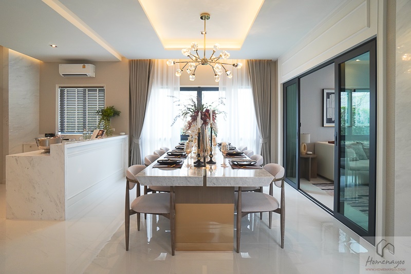 ถัดมาด้านข้างคือห้องรับประทานอาหาร โดยพื้นที่ห้องแล้วเราสามารถจัดโต๊ะขนาด 6-8 ที่นั่งได้สบาย ๆ เลย (หมายเหตุ : การตกแต่งฟังก์ชันมีการปรับใช้เพื่อสำนักงานขาย)