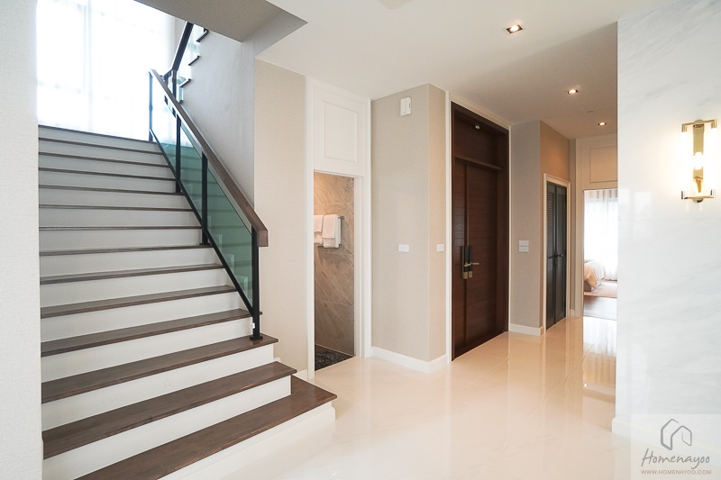 สำหรับบันไดทางขึ้นชั้น 2 มีการออกแบบให้โถงมีความกว้างและโปร่งพอสมควร ตัวบันไดใช้โครงสร้างคอนกรีตเสริมเหล็ก ปิดผิวด้วยไม้สำหรับรูป ติดราวมือจับบันได Tempered Glass มาให้ โดยตัวราวจับจะใช้เป็นไม้สีเข้ากันกับพื้นบันได