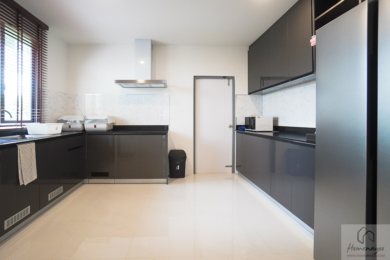 บ้านหลังนี้มาพร้อมกับครัวไทยที่มีขนาดใหญ่มาก มีหน้าต่างระบายอากาศบานใหญ่ รวมไปถึงมีพัดลมดูดอากาศติดตั้งมาให้อีก 1 ตัว พวกเคาน์เตอร์ครัวที่เห็นภายในห้องนี้ ทางโครงการแถมมาให้พร้อมกับตัวบ้าน และจากห้องครัวเปิดออกไปที่ฝั่งหลังบ้าน จะมีห้องนอนแม่บ้าน, ห้องน้ำแม่บ้าน, ห้องซัดรีด และลานซักล้างเตรียมเอาไว้ให้อย่างเป็นสัดส่วน