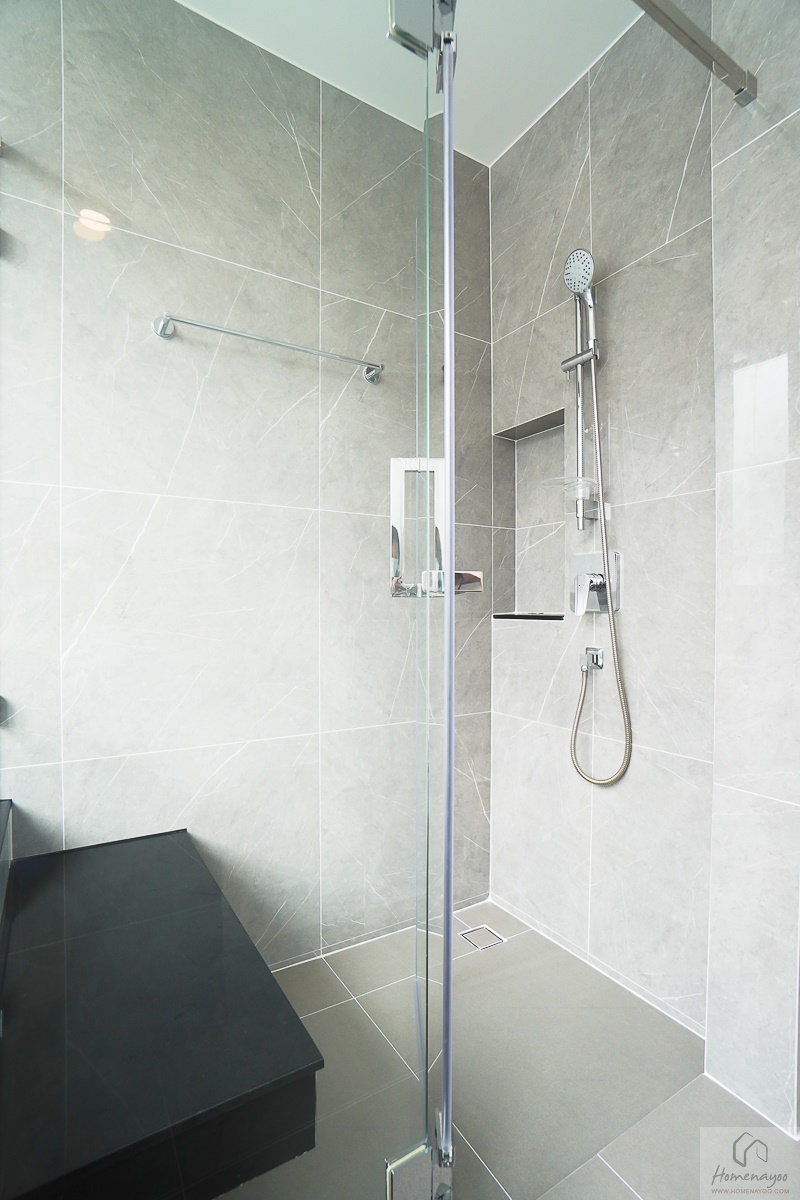 โซนอาบน้ำกั้นส่วนด้วยฉาก Tempered Glass มีราวมือจับและราวแขวนผ้าเช็ดตัวสแตนเลสติดที่ตัวบาน