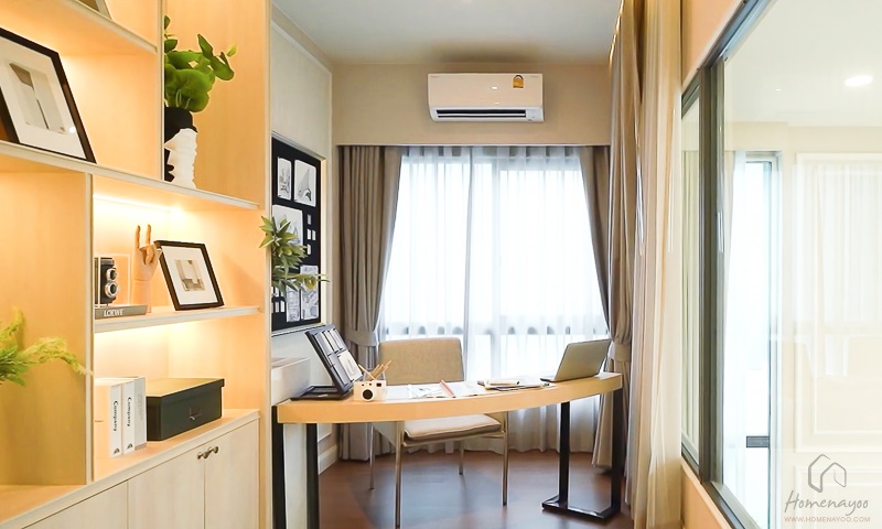 ห้องพระเป็นห้องขนาดไม่เล็กไม่ใหญ่ วางโต๊ะหมู่บูชาได้ หรือจะใช้เป็นห้องอเนกประสงค์ ปรับเป็นห้องทำงานส่วนตัวแบบบ้านตัวอย่างก็ได้เหมือนกัน โดยผนังฝั่งหนึ่งของห้องจะเป็นผนังกระจกเชื่อมต่อกับ Main Living Room ที่ชั้น 1