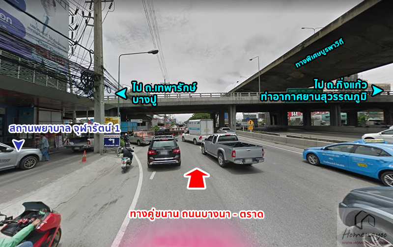 จากนั้นวิ่งตรงตาม ทางคู่ขนาน ถนนบางนา – ตราด ระยะทางอีก 250 เมตร ผ่านซ้ายมือ สถานพยาบาล จุฬารัตน์ 1