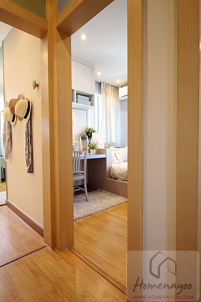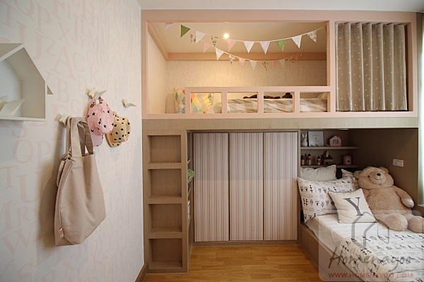 มองไปทางฝั่งหัวเตียง จะเห็นว่าแบ่งเป็นเตียง 2 ชั้นได้เนื่องจากมีเพดานสูง 2.6 ม. ใครมีลูกสองคนก็เป็นไอเดียที่ดีค่ะ ใต้เตียงยังใช้เป็นที่วางตู้เสื้อผ้าเด็กได้อีกด้วย