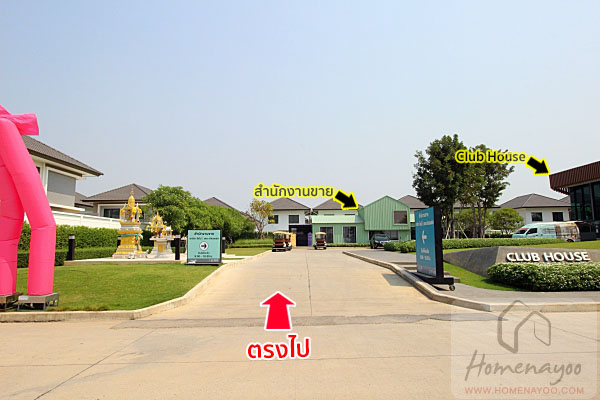 จะเจอทางเข้าสำนักงานขายและทางเข้า Club House อยู่ทางฝั่งขวามือแล้วค่ะ ใครสนใจมาเยี่ยมชมโครงการก็ขับเข้าไปจอดรถหน้าสำนักงานขายได้เลย เดี๋ยวเจ้าหน้าที่ฝ่ายขายจะพานั่งรถกอล์ฟเข้าไปเยี่ยมชมภายในโครงการอีกทีค่ะ