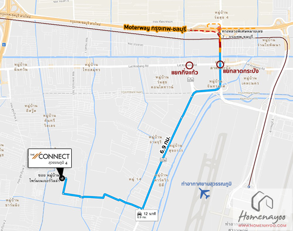 จากปากซอยกิ่งแก้ว 37 (มีวินมอเตอร์ไซค์และ เซเว่น) ไปโครงการเดอะ คอนเนค สุวรรณภูมิ 4 ระยะทาง 2.5 กิโลเมตร