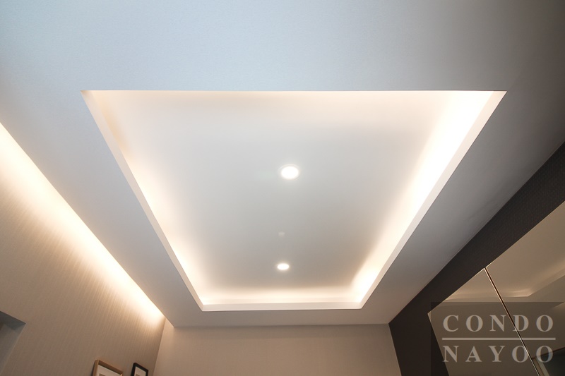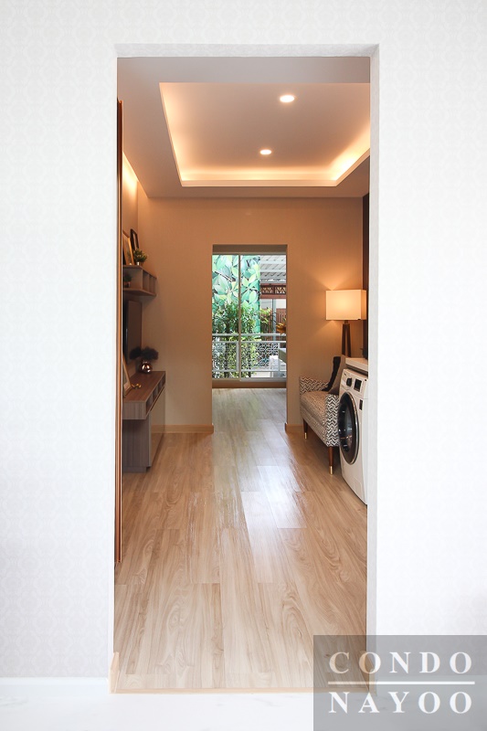 เข้ามาภายในห้องแล้วค่ะ จะเห็นว่ามีการวางแปลนไม่ต่างจากห้องที่แล้วเลย ต่างกันตรงที่ห้องมีขนาดใหญ่ขึ้น และมีห้องอเนกประสงค์เพิ่มขึ้นมา ส่วนวัสดุภายในห้องจะใช้เหมือนห้องที่แล้วทุกประการ ทั้งพื้นกระเบื้องยางลายไม้, ผนังติดวอลเปเปอร์ และฝ้าเพดานฉาบเรียบติดดวงโคมดาวน์ไลท์ ที่สูงถึง 2.5 เมตรค่ะ