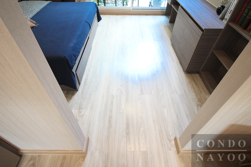 พื้นห้องนอนปูด้วยกระเบื้องยางลายไม้ต่อเนื่องจากส่วน Living Area เข้าไป