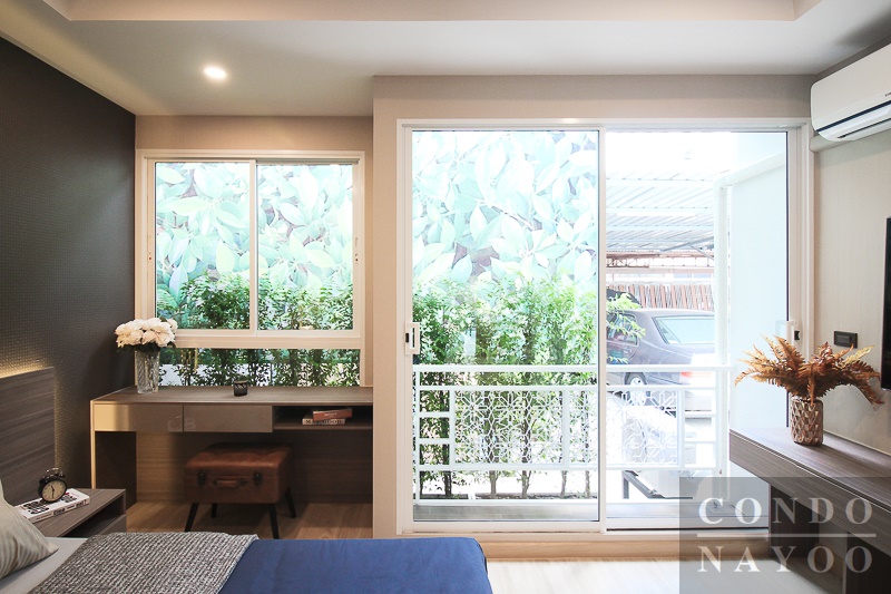 จากห้องนอนจะสามารถเชื่อมสู่ระเบียงได้ ผ่านทางประตูบานเลื่อน สามารถเลื่อนเปิดได้ทั้ง 2 ทาง และทางโครงการจะแถมม่าน 2 ชั้นมาให้ด้วยเช่นกันนะคะ