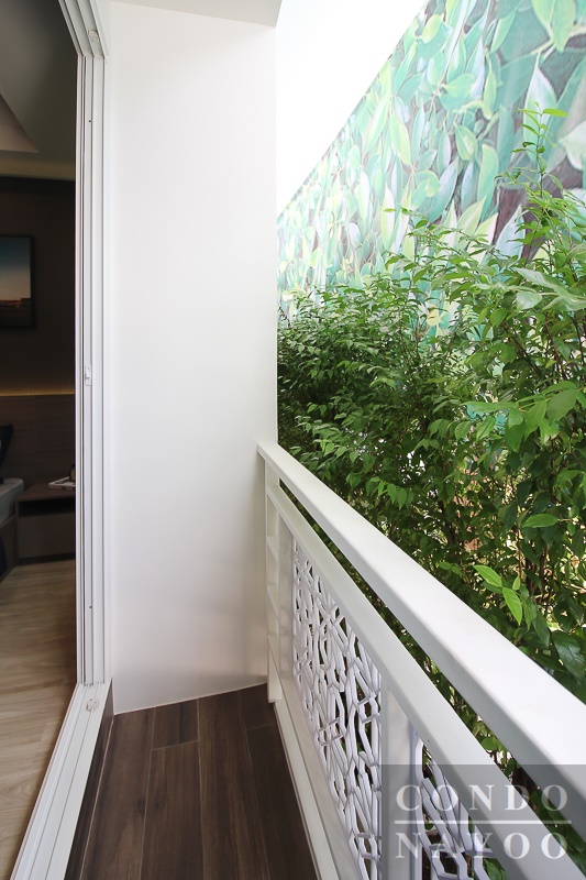 พื้นระเบียงปูด้วยกระเบื้องลายไม้ มีส่วนของธรณีกั้นเอาไว้กันน้ำไหลย้อนเข้ามาในห้อง ส่วนราวกันตกเป็นระแนงเหล็กทาสีขาว ทำลวดลายเป็นดอกไม้เหมือนกับ Facade ของอาคาร