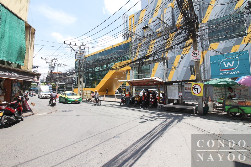 แต่ทำเลที่เราจะมาเดินดูในวันนี้คือ เราจะเดินย้อนออกไปที่หน้าปากซอยลาดพร้าว 1 ไปออกถนนลาดพร้าวกันค่ะ มองออกไปจะเห็นอาคารพาณิชย์เรียงกันเป็นแถวยาวเลย