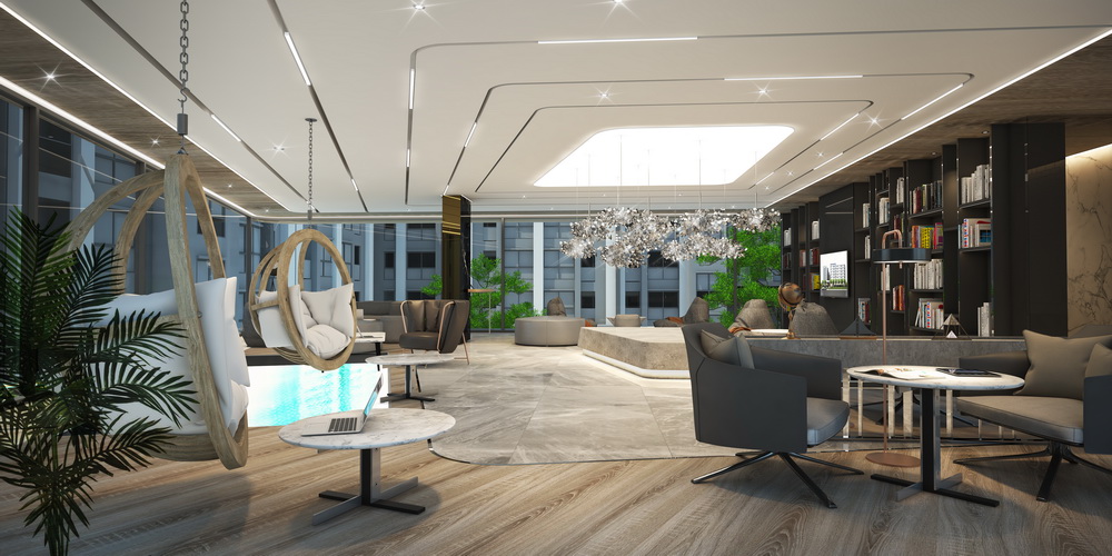 ภาพจำลองบรรยากาศพื้นที่ส่วนกลาง, ฟิตเนส และ สระว่ายน้ำที่ชั้นล่างของโครงการ