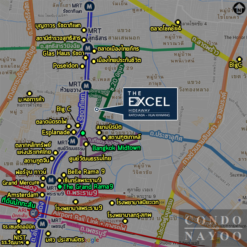 ที่ตั้งโครงการ The Excel Hideaway รัชดา-ห้วยขวาง ตั้งอยู่บนถนนเทียมร่วมมิตร ที่เชื่อมอยู่กับถนนใหญ่รัชดาภิเษกและถนนประชาอุทิศ ซึ่งมีทางลัดเลาะไปออกถนนใหญ่ได้หลายทางค่ะ ส่วนรถไฟฟ้าที่ใกล้ที่สุดคือรถไฟฟ้าใต้ดิน MRT สถานีห้วยขวาง ห่างจากโครงการประมาณ 1 กิโลเมตร