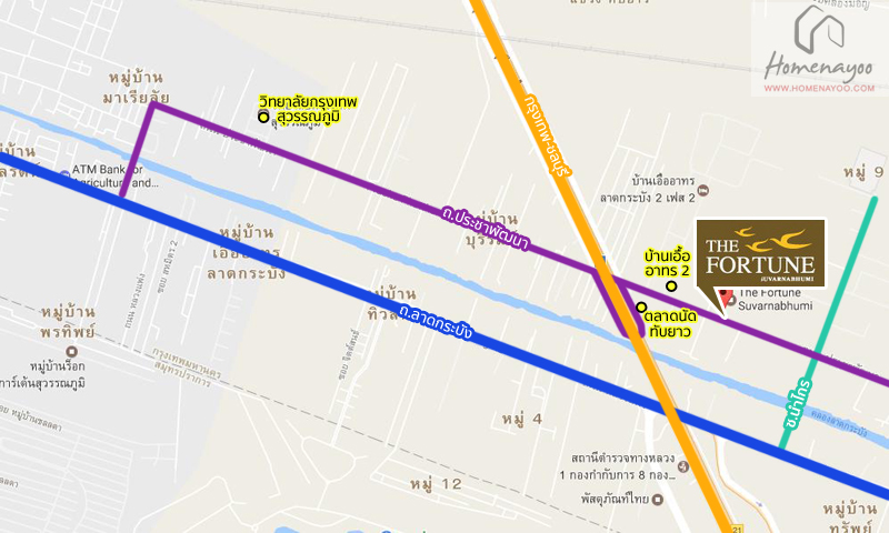 เรามีภาพการเดินทางโดยรถมาให้ชมกัน เส้นทางการเดินทางตามลูกศรแดง โดยเริ่มเดินทางจาก ถนนลาดกระบัง→ ผ่านคลองหัวตะเข้→เลี้ยวซ้ายเข้าถนนประชาพัฒนา→ ผ่านหมู่บ้านเอื้ออาทร ลาดกระบัง 2 → ตรงเข้าไปประมาณ 300 ม. ก็จะเจอพื้นที่โครงการ The Fortune สุวรรณภูมิ แล้วค่ะ