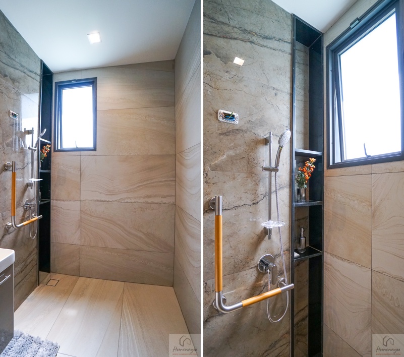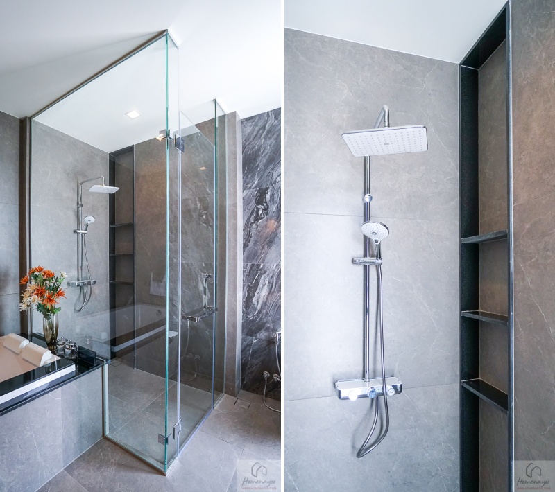 ถัดไปเป็นพื้นที่ส่วนเปียก ด้านในจะติดตั้ง Hand Shower ปรับระดับสูงต่ำได้ พร้อมเดินงานระบบไฟฟ้าติด Junction Box รองรับการติดตั้งเครื่องทำน้ำอุ่นมาให้เรียบร้อย ด้านข้างมีช่องไว้สำหรับวางอุปกรณ์อาบน้ำ ในห้องน้ำดูสว่างเนื่องจากด้านในมีช่องแสง และเป็นบานกระทุ้งให้เปิดระบายอากาศได้