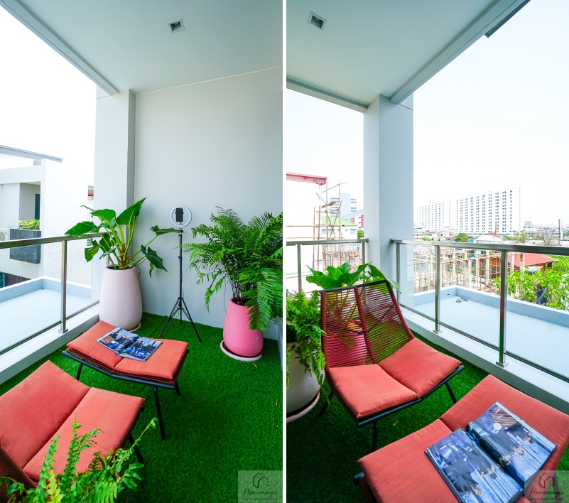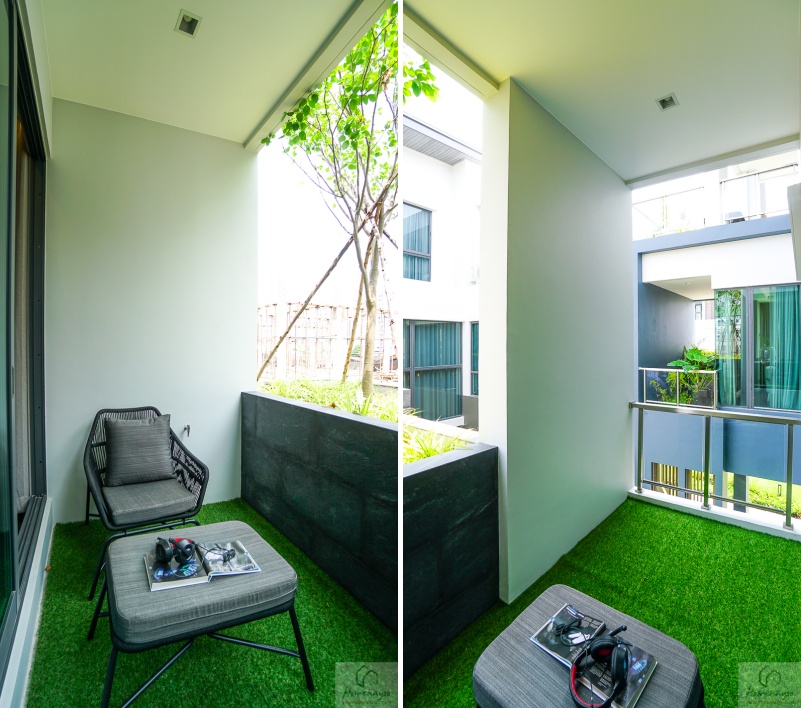 จากห้องอเนกประสงค์จะมีระเบียงส่วนตัวเปิดเชื่อมออกมาได้ ทำเป็นพื้นที่นั่งพักผ่อนจัดสวนตกแต่งได้