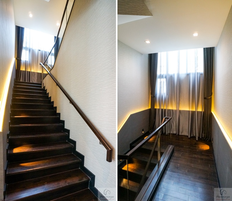 พื้นในห้องนอนชั้นล่างเป็น Soft Floor พื้นชั้น 2-3 เป็นปาร์เก้ไม้สัก บันไดบ้านคอนกรีตเสริมเหล็ก ลูกตั้งและลูกนอนเป็นไม้สักทำสี มีไฟส่องตรงขั้นบันได ราวกันตกเป็นกระจก Temper ผนังจะได้ฉาบเรียบติดวอลเปเปอร์ทั้งหลัง