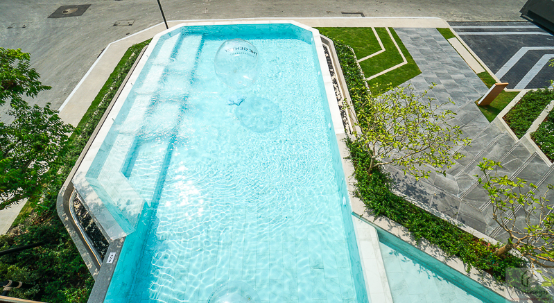 มองลงมาจากระเบียงจะเห็นสระว่ายน้ำที่ชั้นล่างพอดีครับ