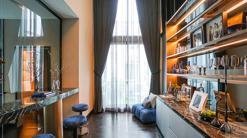 พื้นที่อเนกประสงค์บ้านตัวอย่างกั้นห้องทำเป็น Lounge มีเคาน์เตอร์เครื่องดื่ม และบาร์นั่งดื่ม