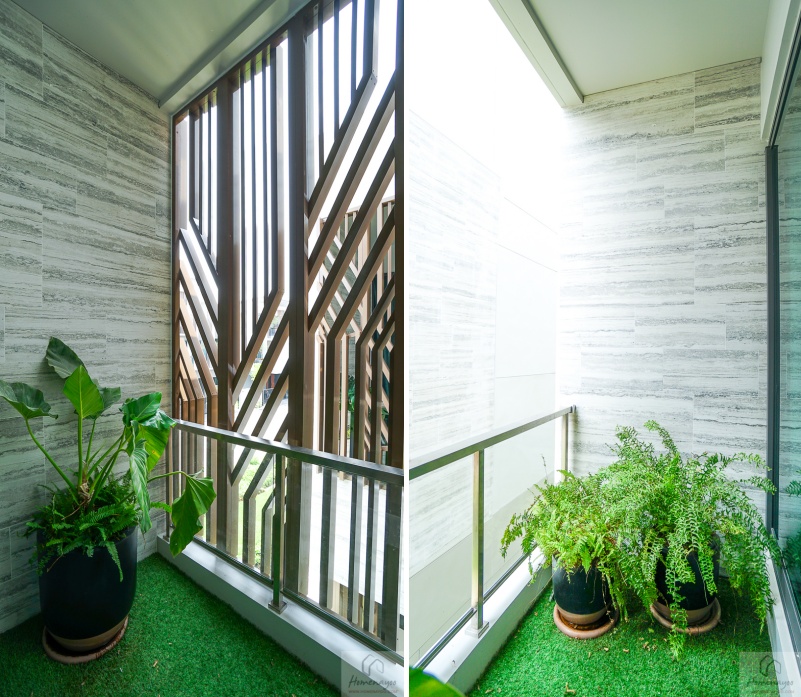 ตรงระเบียงให้พื้นที่มากว้าง วางชุดโต๊ะนั่งพักผ่อนได้ จะจัดส่วนเพิ่มอีกก็ได้เช่นกัน จะเห็นได้ว่าระเบียงของทุกห้องสามารถออกมานั่งเล่นใช้งานได้จริง
