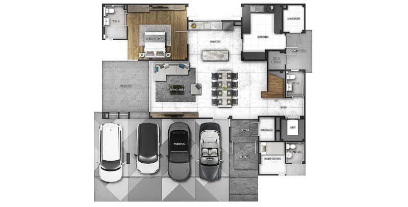 แบบบ้าน Sanctuary มีพื้นที่ใช้สอยมากถึง 660 ตร.ม. รองรับที่จอดรถ 5 คัน พร้อมลิฟต์และสระว่ายน้ำส่วนตัว ภายในบ้านฟังก์ชันจะคล้าย ๆ กัน แต่จะได้พื้นที่มากกว่า ตรงส่วนห้องนั่งเล่นและส่วนรับประทานอาหารขนาดใหญ่ พร้อมฝ้าเพดานแบบ Double Volume เชื่อมต่อกับพื้นที่ส่วนเตรียมอาหาร หรือครัวฝรั่ง มีช่องแสงขนาดใหญ่ที่มองออกไปเชื่อมต่อกับสระว่ายน้ำข้างบ้าน มีห้องนอนขนาดใหญ่ชั้นล่างรองรับพร้อมห้องน้ำ ตอบโจทย์บ้านที่มีผู้สูงอายุ มีครัวไทยแยกเป็นครัวปิดขนาดใหญ่ เชื่อมต่อกับส่วนซักล้างข้างบ้าน และห้องแม่บ้านที่แยกออกจากภายในบ้าน
