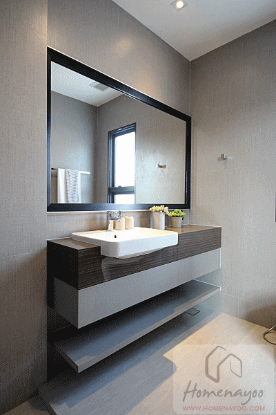 ห้องน้ำจะมีส่วนอาบน้ำ พื้นลดระดับลงไปประมาณ 3 เซนติเมตร สุขภัณฑ์เป็นของ Kohler พื้นห้องน้ำปูกระเบื้องเซรามิกขนาด 60 x 60 cm. พื้นห้องลดระดับลงต่ำกว่าส่วนห้องนอนประมาณ 5 เซนติเมตร