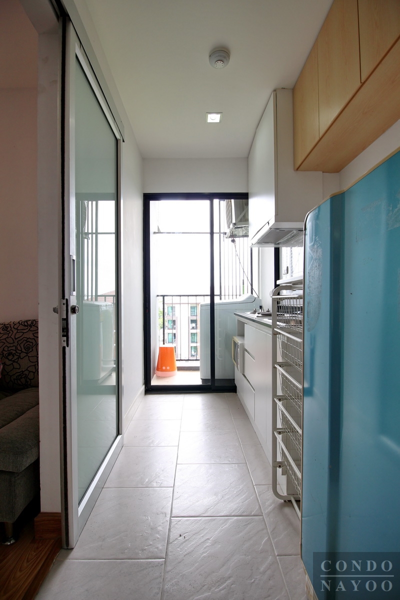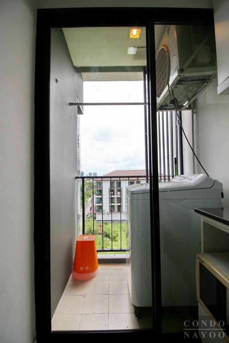 ที่ห้องครัวมีระเบียงอีกจุด แต่ขนาดจะเล็กกว่าระเบียงห้องนอน เหมาะใช้สำหรับวางเครื่องซักผ้า คอมแอร์แขวนขึ้นด้านบน