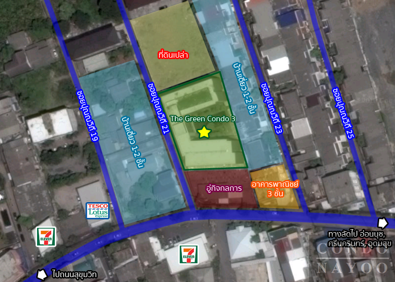 เส้นทางที่ผมใช้เดินทางไปยังโครงการ The Green Condo 3 ในวันนี้ ผมเดินทางมาจากถนนสุขุมวิทมุ่งหน้าฝั่งขาออก ตามแนวเส้นรถไฟฟ้า BTS ไปทางฝั่งบางนา จากนั้นเลี้ยวเข้าซอยปุณณวิถี หรือซอยสุขุมวิท 101 เข้าซอยไปประมาณ 650 เมตร เลี้ยวซ้ายเข้าซอยปุณณวิถี 21 เพียงเล็กน้อยก็จะเห็นตัวโครงการ The Green Condo 3 ตั้งอยู่ทางฝั่งขวามือ มีภาพประกอบการเดินทางดังนี้ครับ