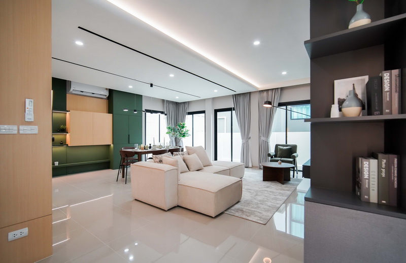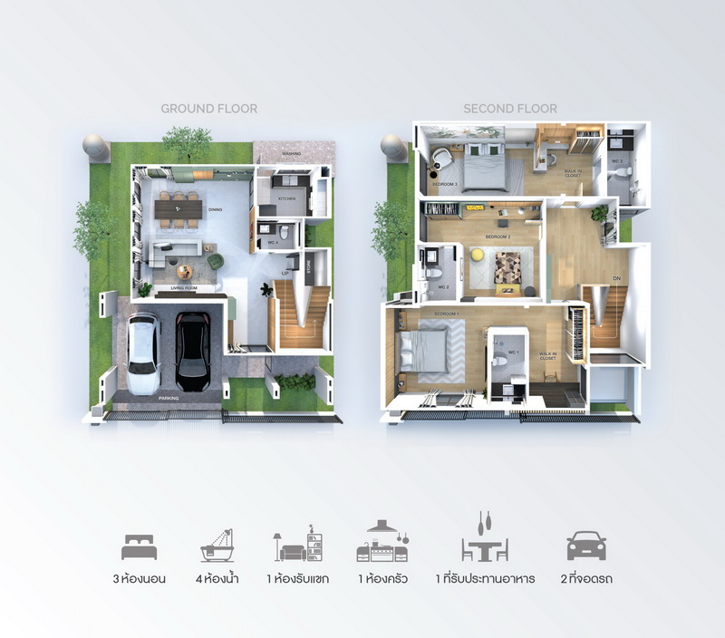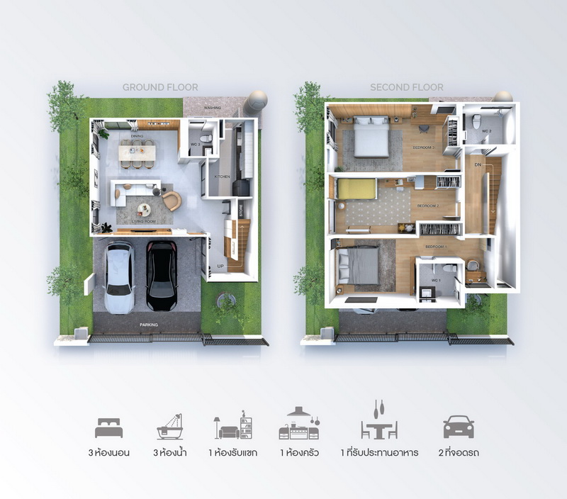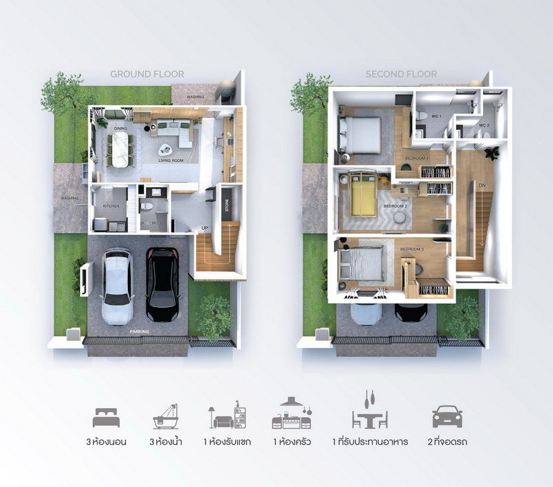 • ฟังก์ชันบ้าน 3 ห้องนอน, 3 ห้องน้ำ, 1 ห้องรับแขก, 1 ห้องครัว, 1 ที่รับประทานอาหาร และ 2 ที่จอดรถ