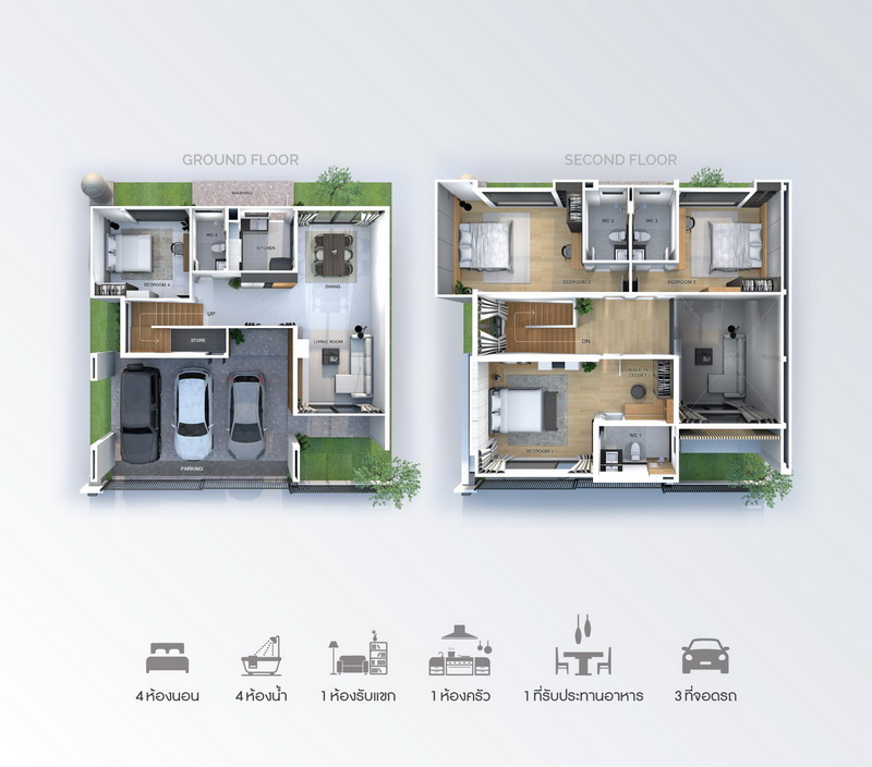 • ฟังก์ชันบ้าน 4 ห้องนอน, 4 ห้องน้ำ, 1 ห้องรับแขก, 1 ห้องครัว, 1 ที่รับประทานอาหาร และ 3 ที่จอดรถ