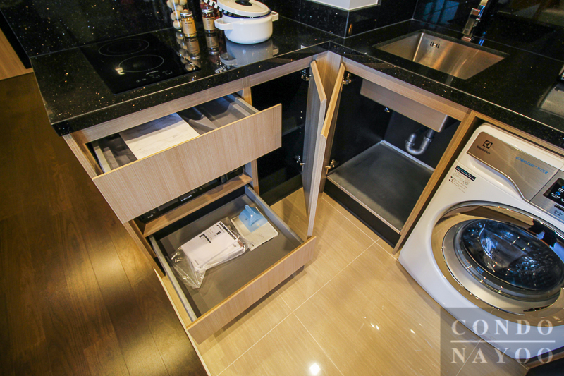 ตรงส่วนครัวจะได้เป็นครัวเปิด ได้ชุดเคาน์เตอร์ครัวตามนี้เลย มีช่องสำหรับวางตู้เย็น เครื่องซักผ้า และไมโครเวฟ