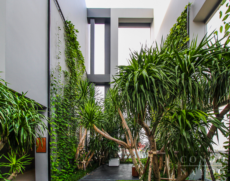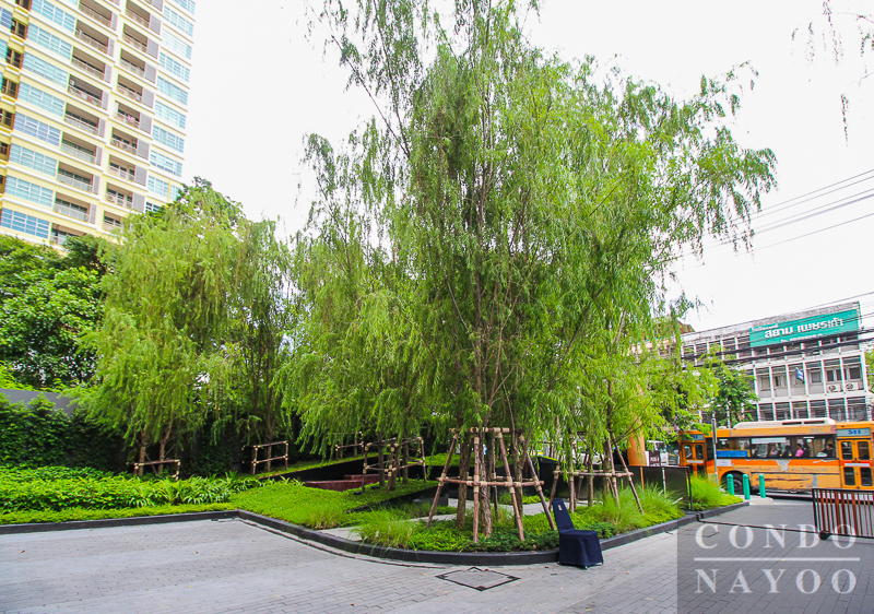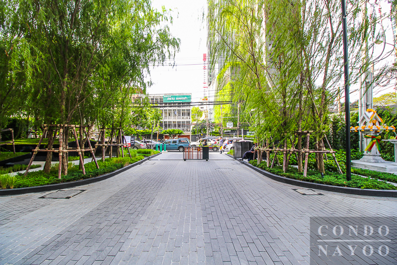 ด้านหน้าโครงการจะไม่มีรั้วทึบ แต่ออกแบบเป็นแนวพุ่มไม้ และต้นไม้