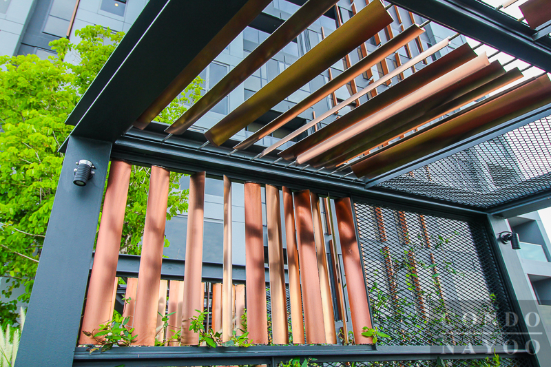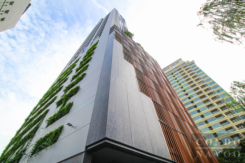 การออกแบบโครงการและวัสดุ – ตัวอาคารออกแบบมาเรียบหรูสไตล์แสนสิริ สถาปนิกที่ออกแบบโครงการนี้คือสมดุล ออกแบบโครงการสวยๆมาแล้วหลายโครงการ ตัวอาคารรูปทรงตัว L มีลูกเล่นที่ Facade ตกแต่งด้วยระแนงอลูมิเนียมสี Copper ถูกดีไซน์ด้วย Parametric Program ที่เจาะจงไล่ความลึกตึ้นไม่เท่ากัน เพื่อให้เกิดมิติที่หลากหลาย เมื่อมองในองศาที่ต่างกัน สลับกับเส้นไฟ LED เวลากลางคืนแสงสะท้อนกับอลูมิเนียมดูสวยไปอีกแบบ นอกจากนี้ตรง Facade ยังมีแผ่นหินแกรนิต Matrix นำเข้าจากอิตาลีตกแต่งอีกด้วย สีภายนอกอาคารจะออกโทนเทาเข้ม โครงการตั้งอยู่บนพื้นที่ดินขนาด 1-2-0 ไร่ ซึ่งมีการจัดวางผังได้เต็มพื้นที่มีสวนด้านหน้า เชื่อมยาวไปด้านหลังโครงการ ชั้น 1-10 เป็นชั้นจอดรถ ชั้นพักอาศัยเริ่มที่ชั้น 11-37 และจัดพื้นที่ส่วนกลางหลักๆไว้ที่ชั้น 1, 11, 31 และ 38