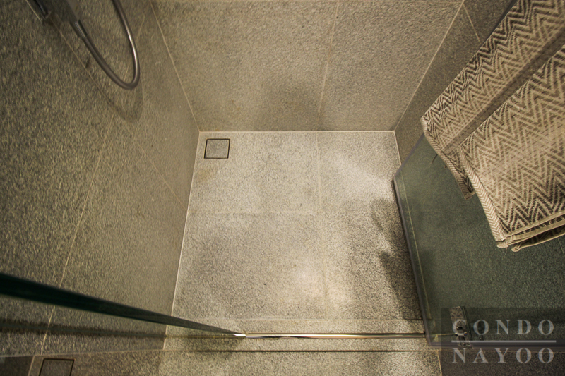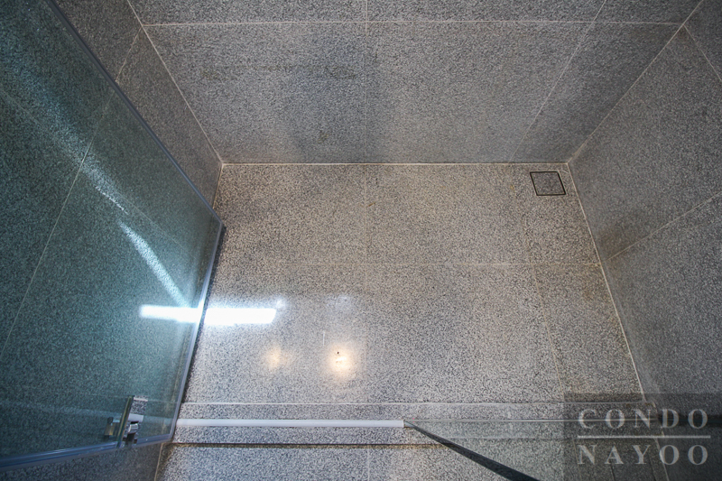 ภายในห้องน้ำมีพื้นที่ส่วนเปียกส่วนแห้ง พื้นและผนังห้องน้ำเป็นหินแกรนิต Misty grey ทั้งหมด ที่พื้นจะเป็นผิวเรียบและด้าน ส่วนที่ผนังผิวจะขรุขระ