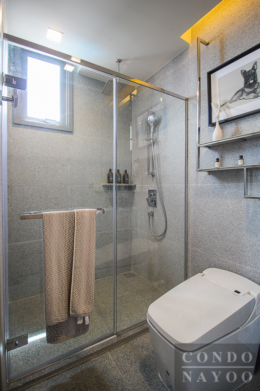 ด้านในเป็นพื้นที่ส่วนเปียก ติดตั้งฉากกั้นอาบน้ำมาให้แบบานเปิด ซ้ายมือที่ผนังมีช่องไว้ให้วางของได้