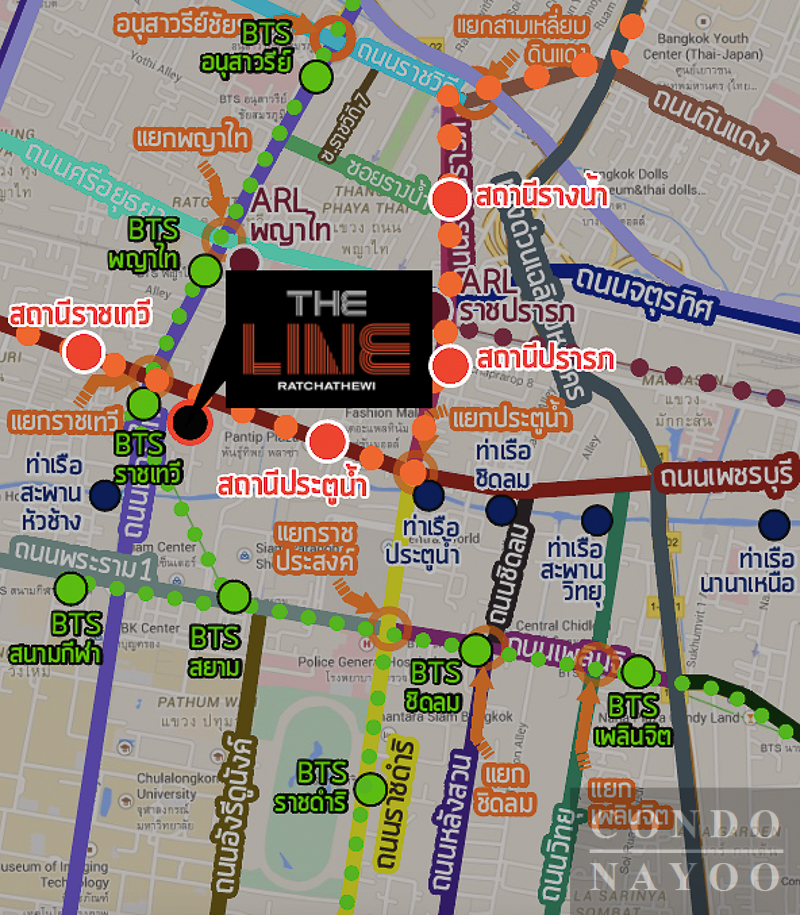 ทำเลที่ตั้งโครงการ – The Line ราชเทวี ตั้งอยู่ติดถนนเพชรบุรี ตรงปากซอยเพชรบุรี 18 ทำเลถือว่าอยู่ใจกลางเมือง ย่านนี้เป็นแหล่งพาณิชยกรรมที่สำคัญแห่งหนึ่งของกรุงเทพฯก็ว่าได้ อยู่ใกล้สถานที่สำคัญๆทั้งห้างสรรพสินค้าใหญ่ๆ อาคารสำนักงานต่างๆ โรงแรม โรงเรียน มหาวิทยาลัย ซึ่งเมื่อใกล้สถานที่สำคัญแบบนี้แล้วเรื่องความอุดมสมบูรณ์คงไม่ต้องพูดถึง ย่านนี้ของกินเพียบครับตั้งแต่ร้านเล็กๆริมทาง ไปจนถึงร้านหรูๆในห้างสรรพสินค้า มี 7-11 ใกล้ๆตรงปากซอยกรุงเทพการบัญชี