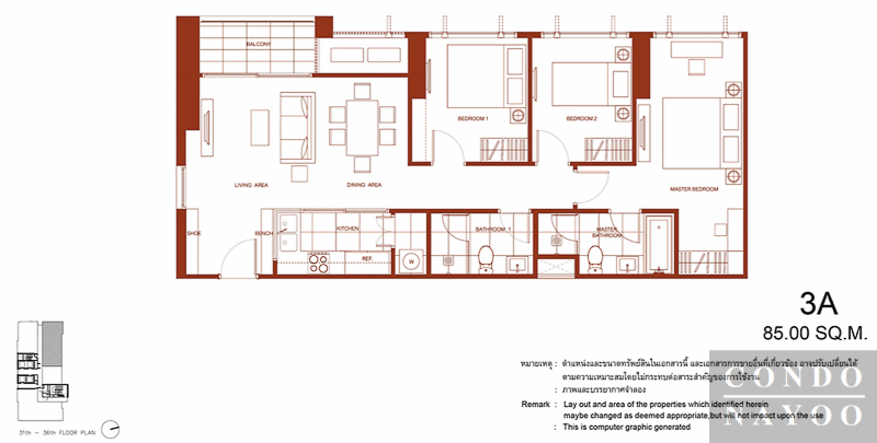แบบแรกที่จะพามาชมเป็น 2 Bedroom ขนาด 59.00 ตร.ม. เดินเข้าห้องมาเจอส่วนครัวก่อนได้เป็นครัวเปิด เชื่อมกับส่วนห้องนั่งเล่น ด้านในสุดเป็นระเบียงเป็นแบบ Double skin facade ฝั่งขวาจะมีทางเดินไปห้องน้ำ และห้องนอนทั้ง 2 ห้อง Master Bedroom จะอยู่ด้านในสุดมีห้องน้ำในห้องนอน