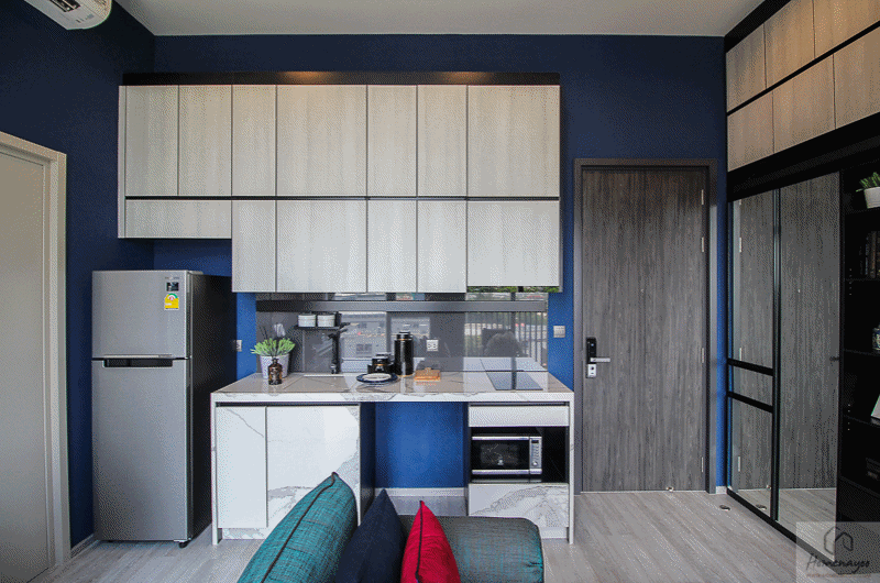ติดกับประตูห้องจะเป็นชุดเคาน์เตอร์ครัวได้ชุดใหญ่ตามนี้เลย มีแบ่งช่องไว้วางไมโครเวฟ เครื่องซักผ้า และตู้เย็น