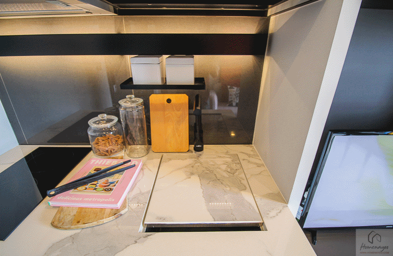 อีกฝั่งเป็นชุดเคาน์เตอร์ครัว ได้เป็นตู้บานเปิด 8 บาน และลิ้นชัก 3 ช่อง มีช่องสำหรับวางไมโครเวฟ หน้าบานตู้ข้างล่างปิดผิวด้วยกระเบื้องพอร์ซเลนลายหินอ่อน